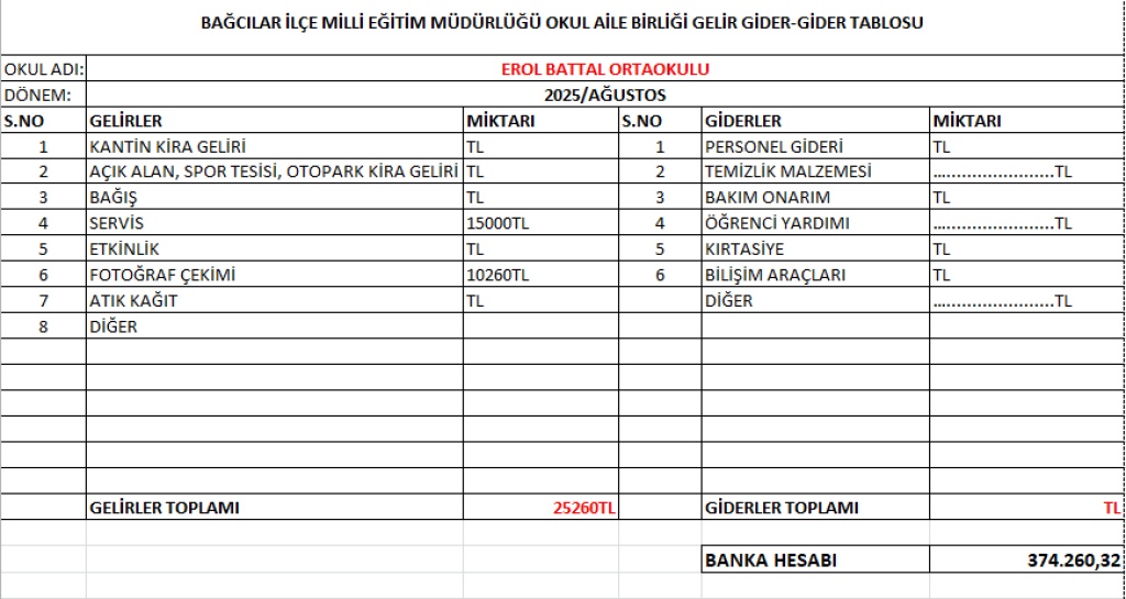2025 AĞUSTOS AYI GELİR - GİDER TABLOSU
