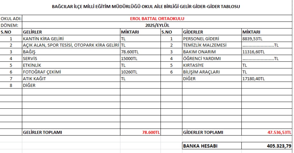 2025 EYLÜL AYI GELİR - GİDER TABLOSU