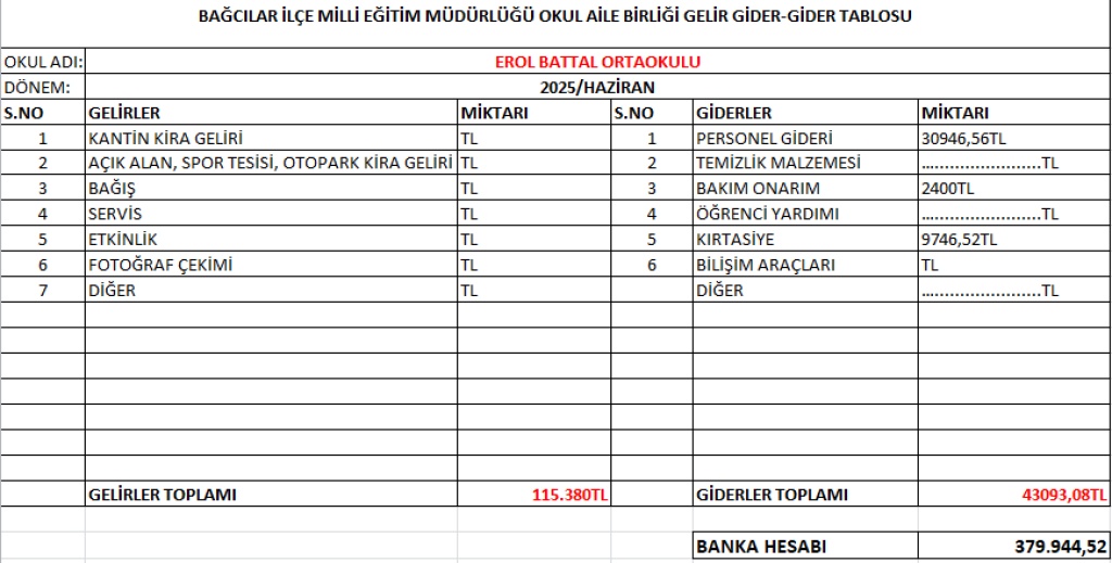 2025 HAZİRAN AYI GELİR - GİDER TABLOSU