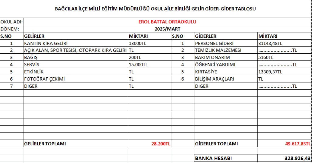 2025 AĞUSTOS AYI GELİR - GİDER TABLOSU