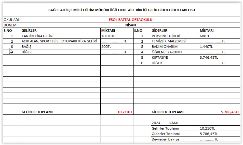 2024 NİSAN AYI GELİR - GİDER TABLOSU